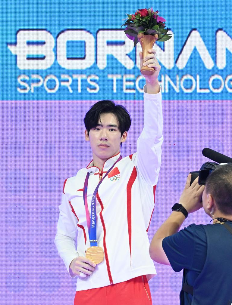 图为张博恒在杭州亚运会竞技体操男子全能领奖台上。新华社记者程敏摄