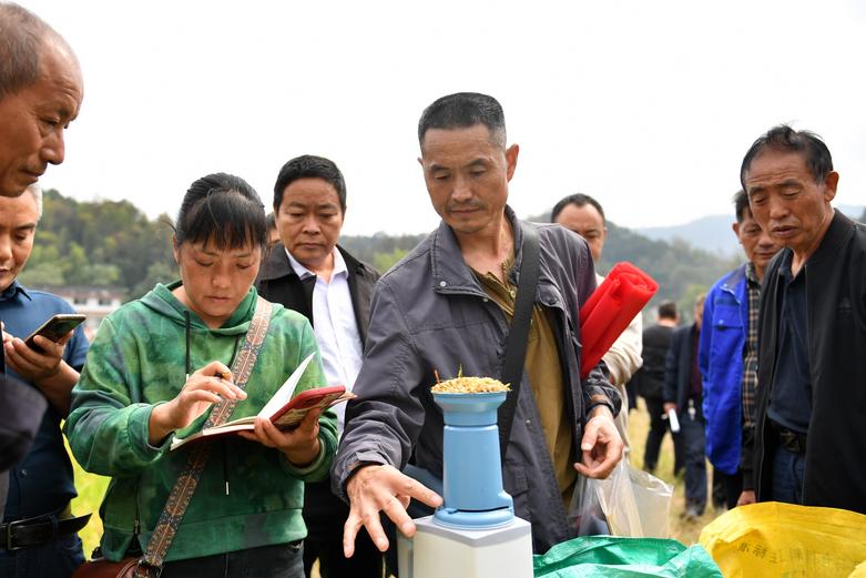 10月28日,在位于娄底市双峰县永丰街道松坪村的“稻再油”示范片,工作人员检测再生季稻谷含水量。 新华社记者 陈振海 摄