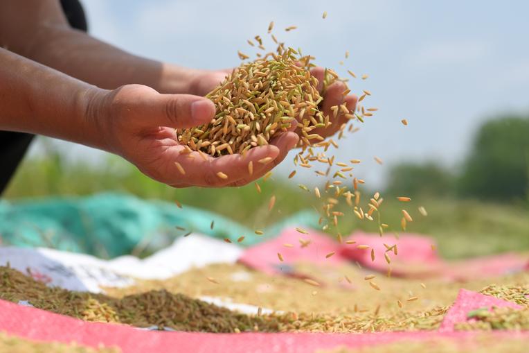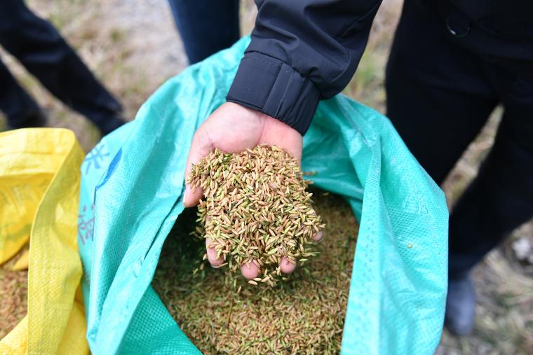 这是8月10日在娄底市双峰县印塘乡盐井湾村“稻再油”示范片拍摄的头季稻谷。 新华社发(李建新摄)