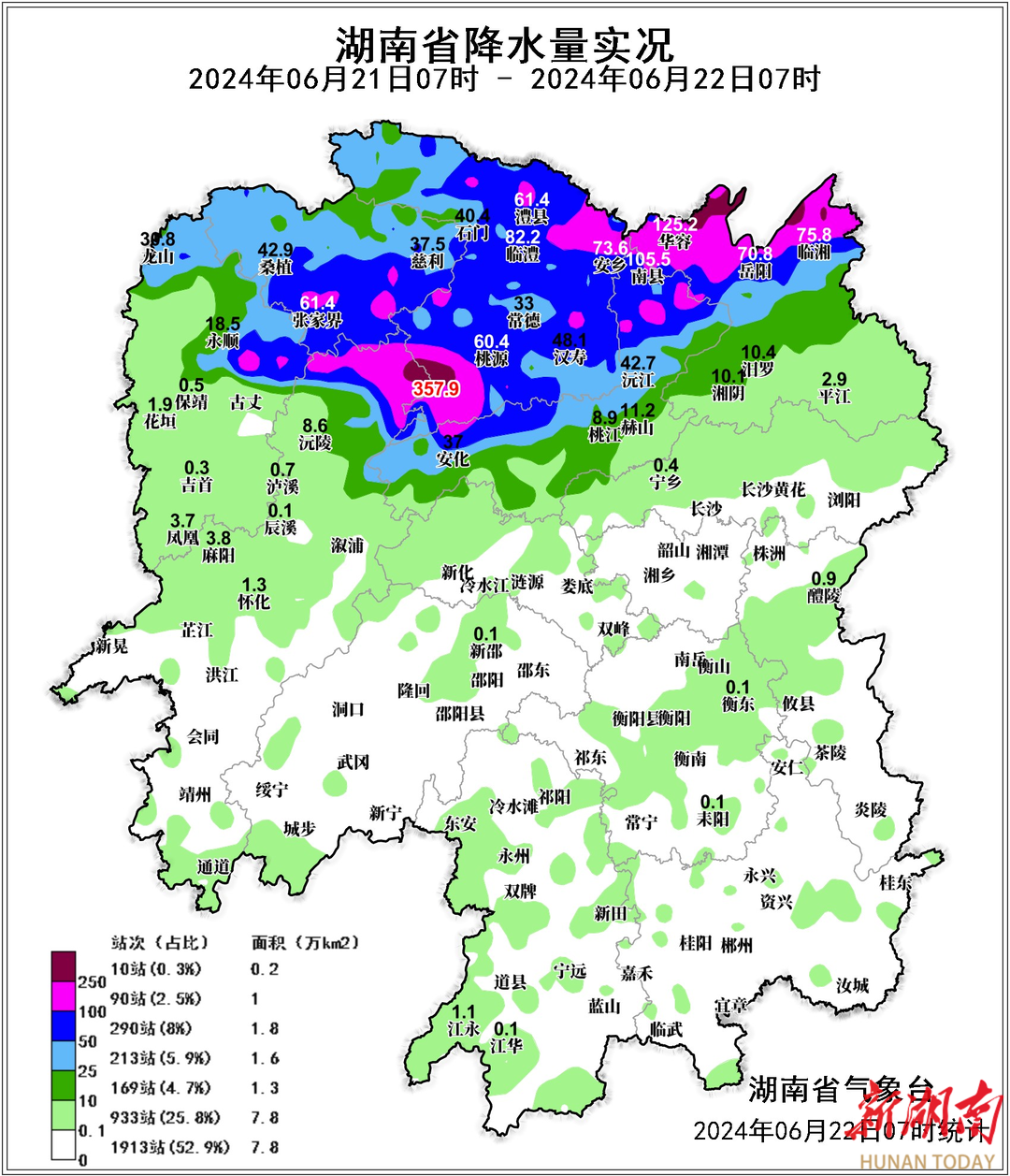 6月21日7时至22日7时,全省211乡(镇)出现暴雨,雨量最大为桃源夷望溪镇357.9毫米,未来三天湘中、湘北有大到暴雨,局地大暴雨。