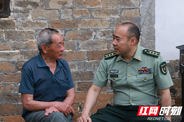 93岁的志愿军老战士黄时汪(左)向工作人员讲述自己的从军经历。