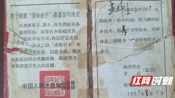 红网时刻新闻7月24日讯(记者 陈宗昊 通讯员 袁德华)近日,今年93岁的志愿军老战士黄时汪将自己珍藏多年的“一级优等射手”荣誉证亲手交到湖南省革命军事馆文物征集永兴县工作专班人员手中,以作为对湖南革命军事馆文物史料征集活动的支持。