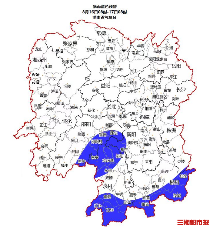 湖南省气象台8月16日06时发布暴雨蓝色预警:预计16日8时至17日8时,衡阳西北部、邵阳东部、郴州南部、永州大部将出现暴雨,并伴有短时强降水、雷雨大风等强对流天气,请加强防范。