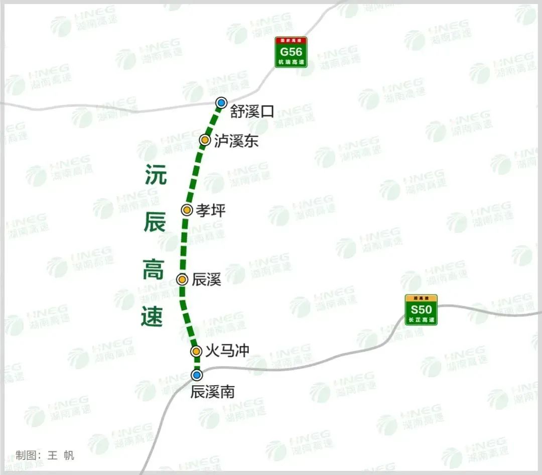 沅辰高速公路项目起于沅陵县盘古乡舒溪口,接常德至吉首高速公路,往南经辰溪县长坡、船溪、田湾、城东、石壁,止于辰溪县火马冲镇木桥江,与溆浦至怀化高速公路相接,全长50.489km。主线采用四车道高速公路标准建设,设计速度100km/h,路基宽度26m,沥青混凝土路面,桥涵设计汽车荷载等级采用公路-I级。全线设置舒溪口(枢纽)、泸溪东、孝坪、辰溪、火马冲、辰溪南(枢纽)6处互通式立交,4个匝道收费站,1个桥隧监控所,1个养护工区,1个路政基地,1个高速交警基地,1个服务区。
