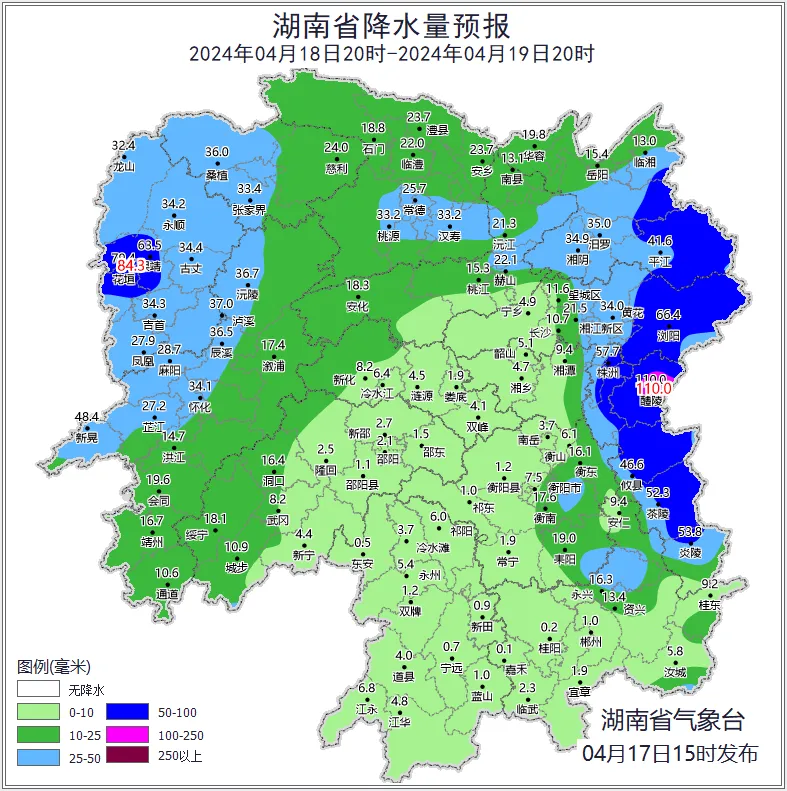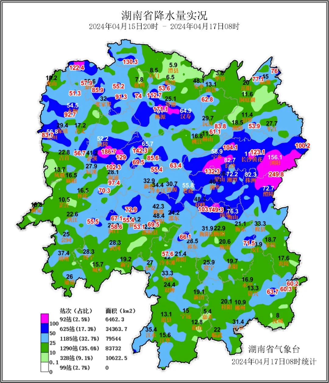 湖南省4月15日20时至17日08时累计降雨量实况图