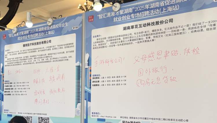 在招聘会现场,记者看到各家企业拿出各种强有力的条件吸引人才,“AI企业、年薪50万”“不提倡996”“父母感恩津贴体检”“国外旅行”“购房无息贷款”……企业在展板上手动写出大大的优势条件。