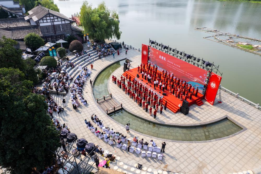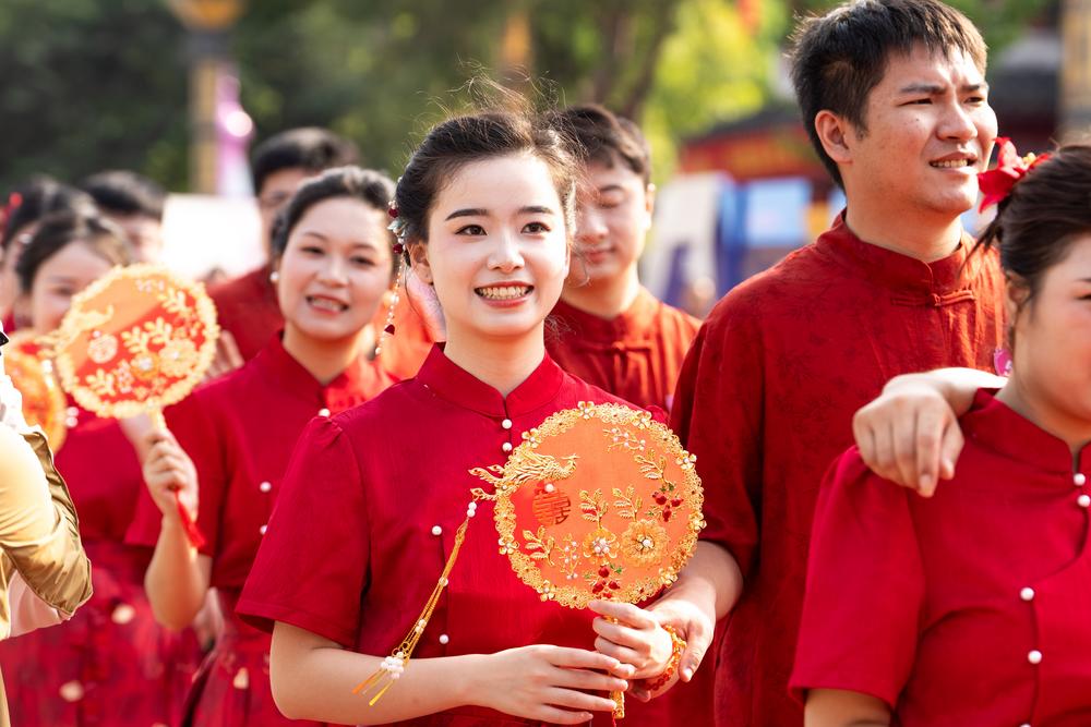 8月30日,湖南省第十届国潮集体婚礼在常德河街春秋广场举行, 77对新人身着简约中式婚服,在喜庆浪漫的氛围中交换信物、许下爱的誓言,与家属代表共同见证这一幸福时刻。