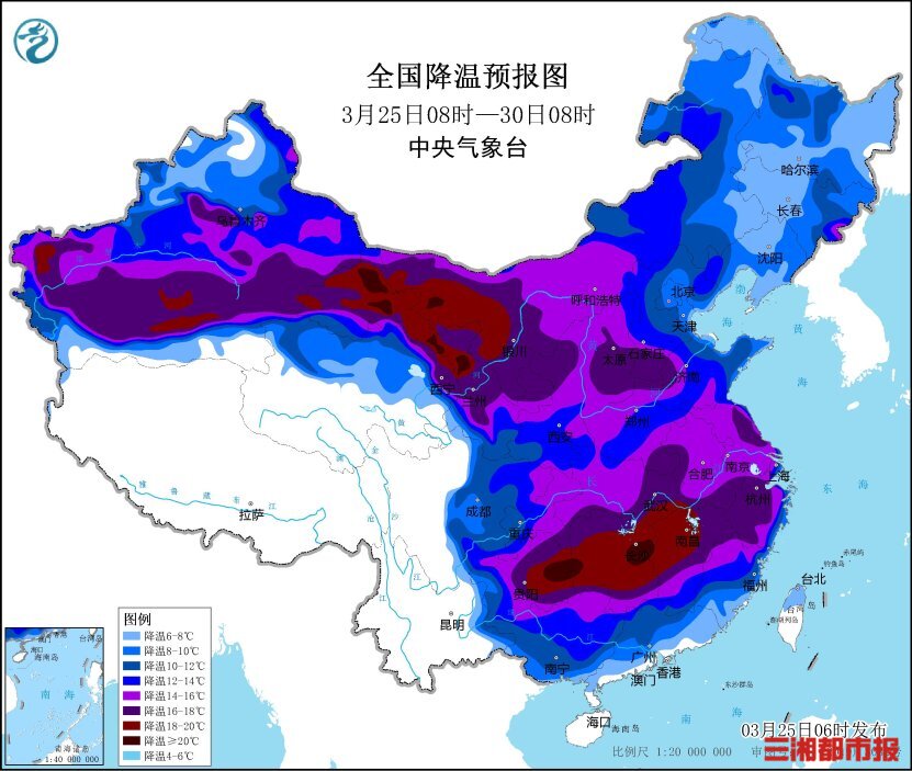 记者通过中央气象台预报图发现,从3月25日8时至3月30日8时,5天时间内,湖南大部降温幅度达18—20℃,其中湘中等部分地区降幅更超20℃。从地图显示,此轮寒潮过程,湖南大部处降温核心区域。