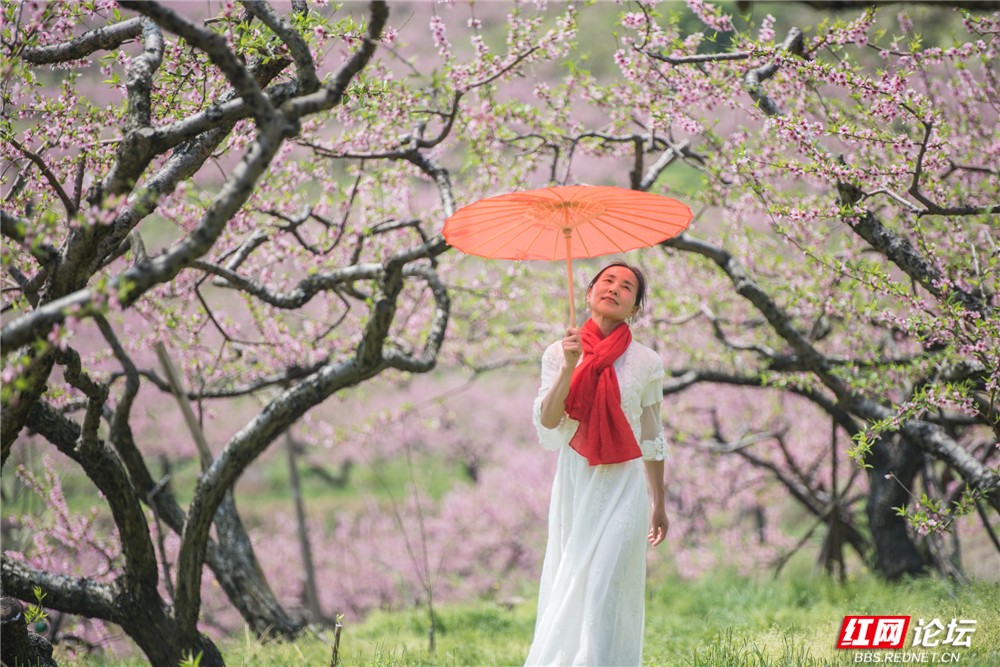 ▲图说:怀化麻阳苗族自治县兰里镇横喇村有近千亩黄桃基地。桃花已经盛开个把星期了,再不去打卡,就得等来年了。清明假期,我约人去打卡,拍了组人像,现分享给大家。
