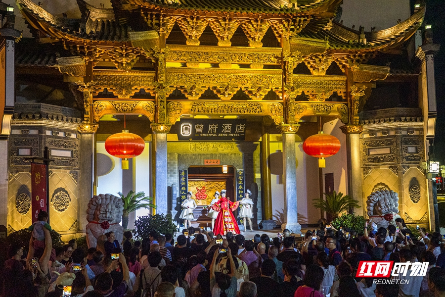 洪江古商城沉浸式夜游演艺“又见小城故事”吸引游客驻足观看。