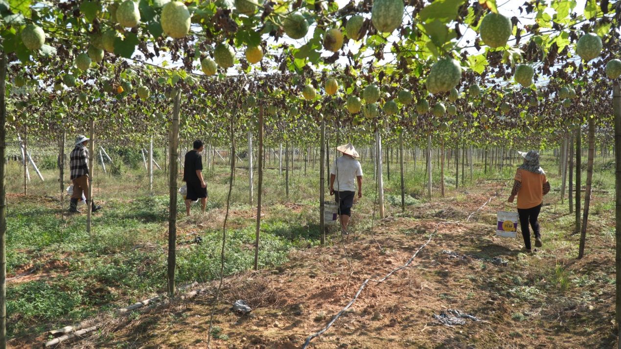 村民们穿梭于藤蔓之间,娴熟地采摘着成熟的吊瓜,装桶搬运;加工区内,大家麻利地筛选、清洗,洗净的湿籽装袋后便被运往晾晒场。