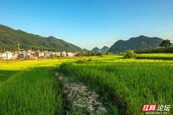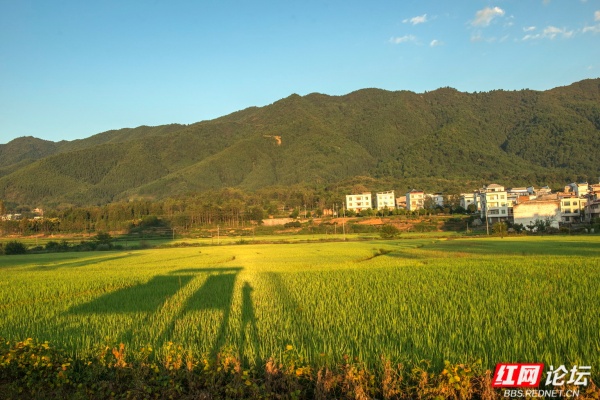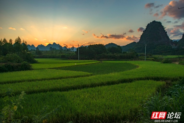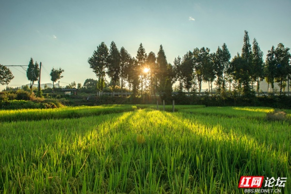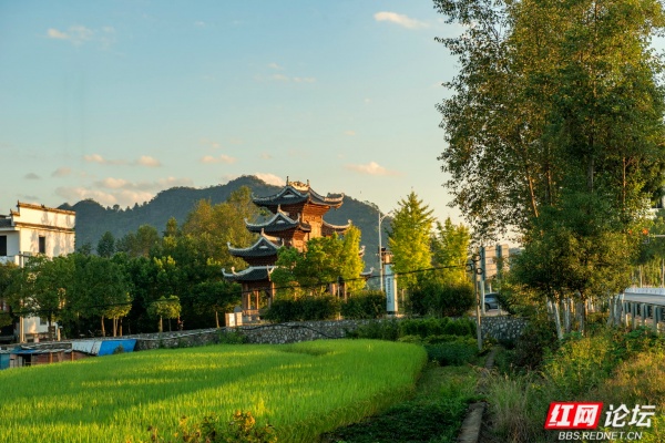 10月5日,在宁远县湾井镇路亭村,清晨推窗,东方已燃得漫天通红,一轮旭日正酝酿着跃出地平线。窗外的田园被南北向的冷九公路与东西向往湾井镇的公路切出“十字架”形状,路口的红绿灯在晨雾里若隐若现,西侧村口那座古式牌坊格外气派,“路亭”二字鎏金般嵌在坊额上,穿过牌坊的村道笔直延伸。