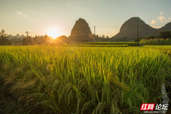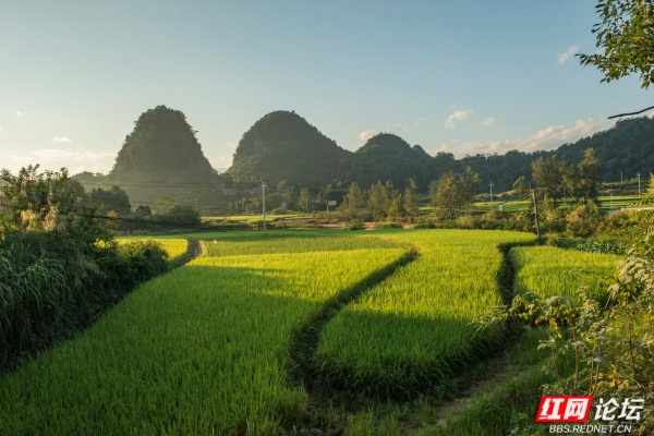 牌坊对面的鱼塘恰是观日出的好地方,塘边农田层层铺开,朝阳从左前方的喀斯特山峦后升起,那山形似卧倒的葫芦,倒影清晰地浸在潭水里,连晨雾都成了勾勒轮廓的轻纱。我蹲在塘边,将山影、波光与田园一并收入镜头,等太阳完全跳出山尖。