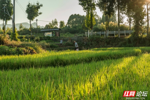 再往北走,便撞见村里早起的村民在地里挖红薯和浇水。晨光从公路两旁树木的缝隙里漏下来,在田埂上织出斑驳的网,稻叶上的露珠还没散尽,被光一照,像缀在绿绸上的珍珠。村民弯腰劳作的身影落在光影里,轮廓分明,与身后的村庄、远山、蓝天连成一片,连路边每一棵树木的轮廓都清晰得不含杂质,这哪里是风景,分明是把生活过成了诗。