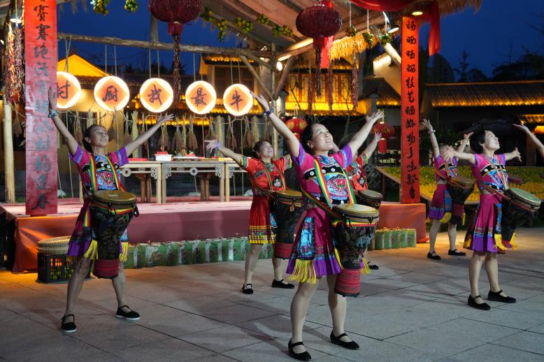 当天下午五点半,激昂的迎宾鼓点拉开了活动的序幕。嘉宾们在主持人的陪同下移步换景,乡村活力的生动注脚在各个展馆间铺陈开来:打铁工坊里火花四溅,竹编技艺展示区巧手翻飞,民族服饰走秀衣袂翩跹,而农特产品试吃区与“纳福村集”直播间里,更是弥漫着黄金茶、黄金橙的馥郁香气,回荡着为家乡好物助力的卖力呐喊。