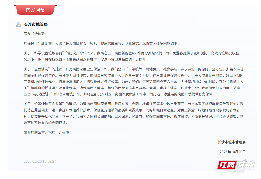 红网时刻新闻10月22日讯(记者 陈星晓)近日,有网友在红网《问政湖南》栏目留言,指出长沙作为网红城市,部分商圈存在“又脏又臭”等问题,影响游客体验,并就此提出设置垃圾容器、增加绿植、全面清洗等具体建议。长沙市城管局近日作出详细回应,公布了系列已实施及计划中的整改措施。