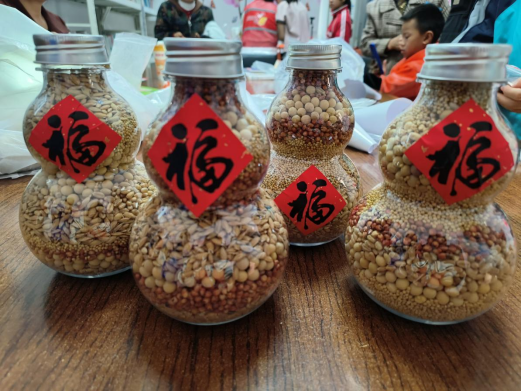 活动最后,孩子们在新华书店老师的指导下做“五谷丰登”瓶。老师特意带来了稻、黍、稷、麦、菽五谷,孩子们小心翼翼地把这些粮食装进瓶子里,说要把今天学到的知识、看到的丰收都“藏”进去。
