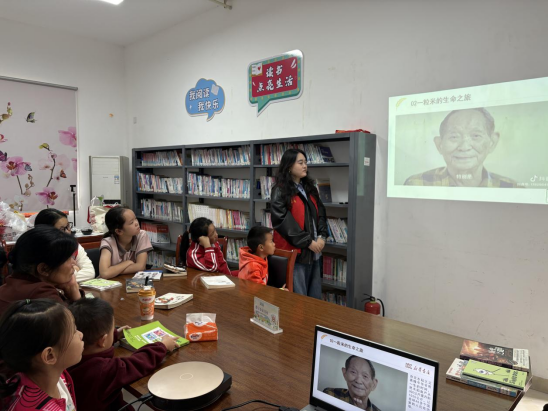 谈及“杂交水稻之父”袁隆平爷爷的故事时,书屋瞬间陷入一片肃穆。孩子们屏息凝神,听着袁爷爷一生扎根稻田、潜心研究,将水稻亩产从300公斤提升至1000公斤以上,用一粒种子改变世界、让无数人远离饥饿的传奇。一双双清澈的眼睛里,渐渐盈满敬佩与动容;而在场的村民们,望着窗外金黄的稻田,更添几分共鸣——这便是用一生践行“为农办实事”的榜样,是刻在乡土里的精神丰碑。