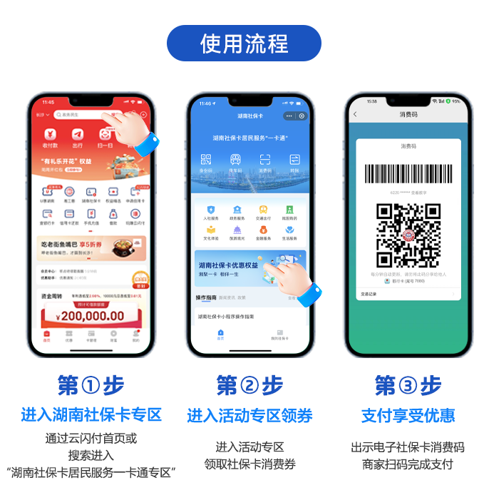 如何参与?湖南社保卡持有者,在省内指定的电影院、加油站以及百货超市等,打开云闪付APP,进入湖南社保卡专区,使用消费码,选择社保卡金融账户支付,即可享受优惠。