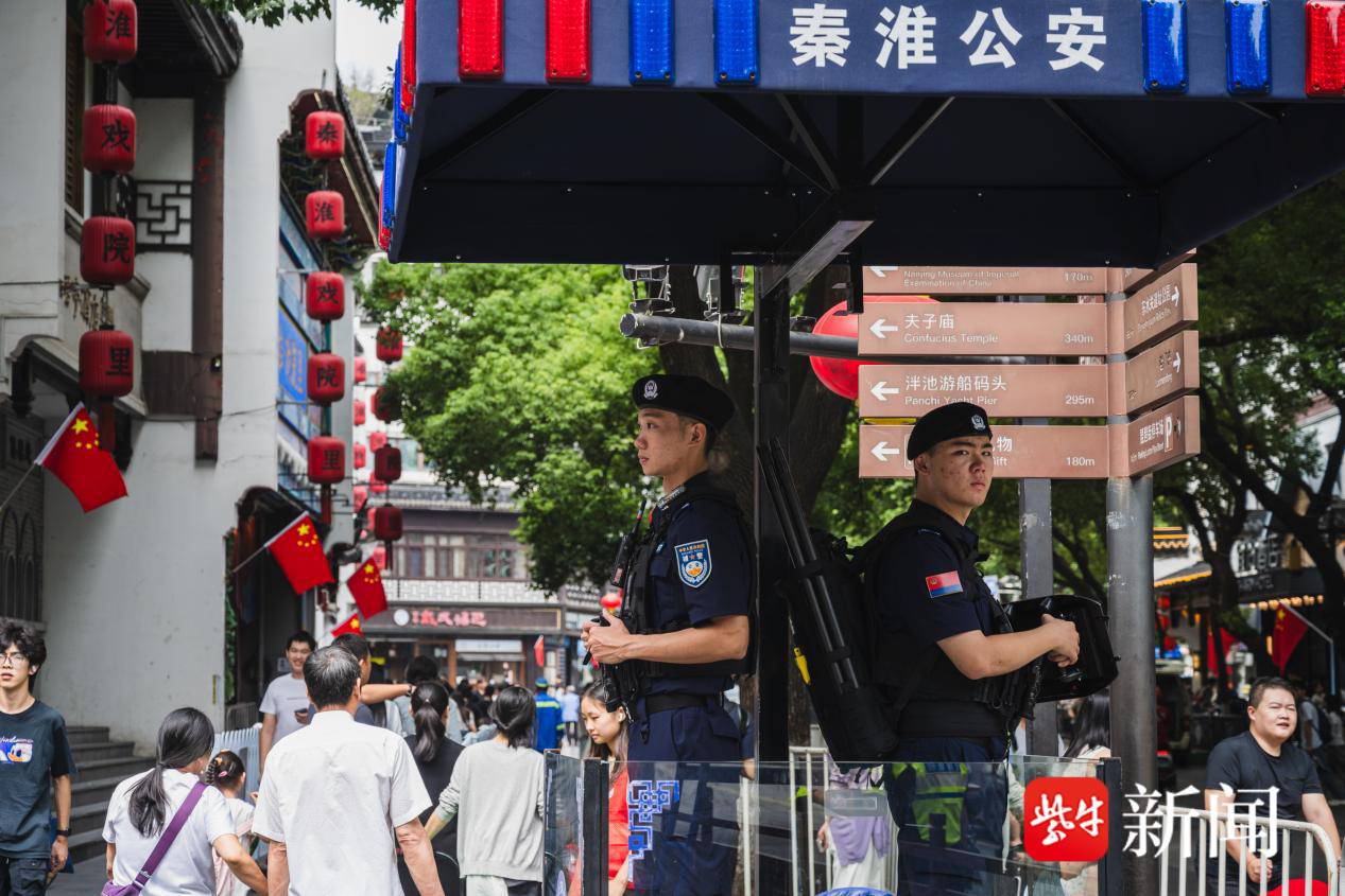 据悉,黄金周期间夫子庙景区内,公安、武警、城管、环卫、市监等多部门工作人员全天候值守,维护景区安全有序、道路洁净,营造了安全、安心、舒适的游览环境。