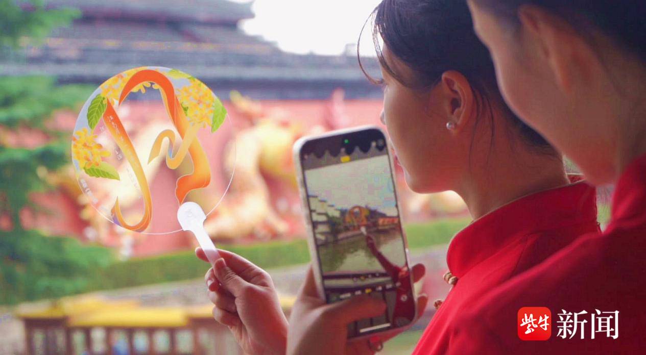 在夫子庙大成殿前、文德桥畔、科举博物馆明远楼前等秦淮的“最美赏月地”,随处可见手持团扇拍照的游客。有人将团扇举至桥头,让扇面透卡与真实月色重叠,拍出“诗画合一”的意境;有亲子家庭带着孩子寻找扇面上诗句对应的景点,边打卡边讲解诗词。
