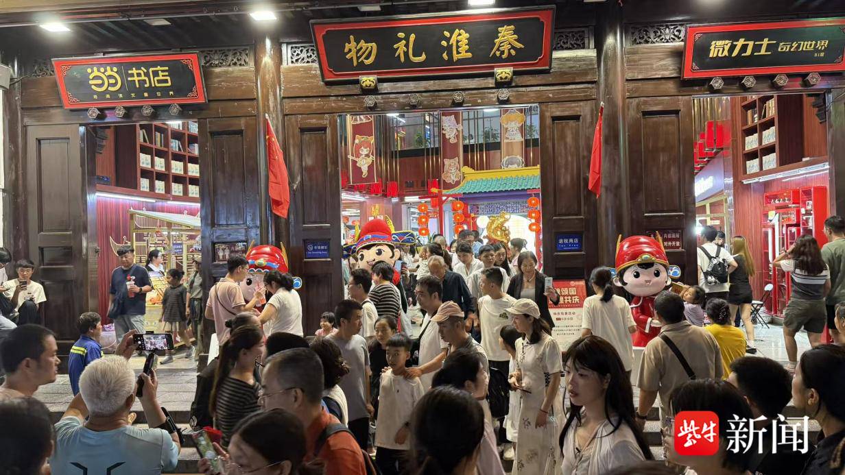在保持文化吸引力的同时,夫子庙景区不断拓展消费新业态,让游客把在秦淮的游玩体验“记在心里,带回家里”。贡院街上的秦淮礼物旗舰店前,排队购买文创的游客络绎不绝,各类将历史文化、秦淮美景融入日常的冰箱贴、摆件、书签、非遗手工艺品等深受游客青睐。“这件冰箱贴,把大成殿、棂星门、魁星阁、秦淮画舫‘同框呈现’,既设计精巧,又能让孩子记住相关文化,很有意义。”来自苏州的游客陈女士对记者说。