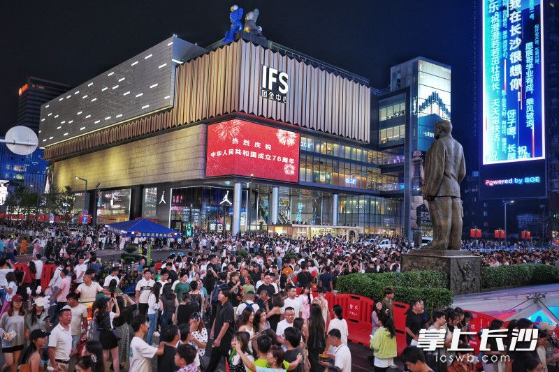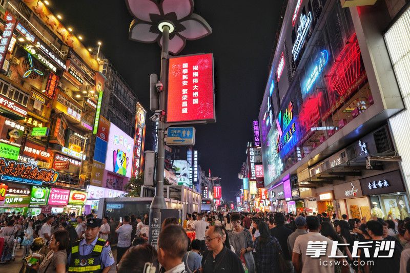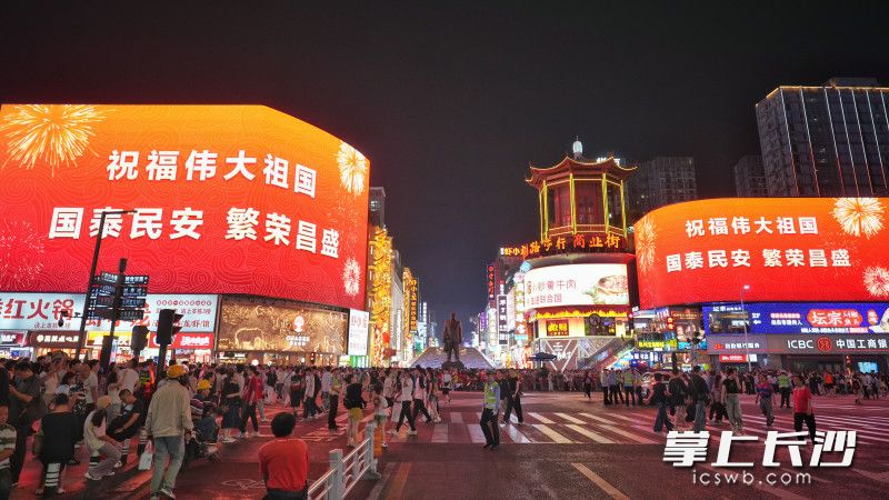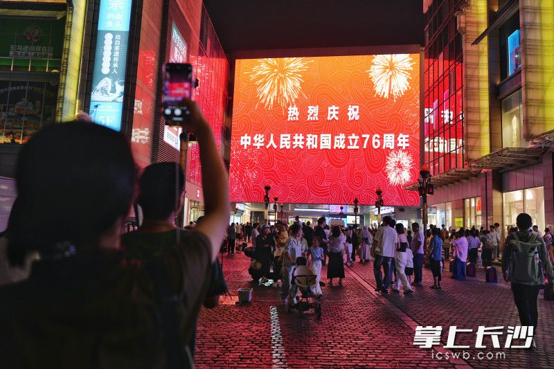 国庆节当天,长沙街头不少LED大屏轮番播放“热烈庆祝中华人民共和国成立76周年”“祝福伟大祖国 国泰民安 繁荣昌盛”,营造出浓浓的节日氛围,吸引不少游客拍照纪念。