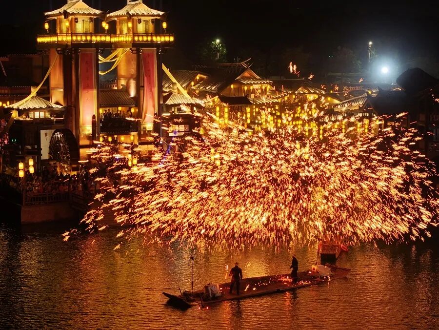 ▲衡阳市南岳区举行南岳里庙会民俗活动,当地居民通过舞龙舞狮、打铁花等丰富多彩的非遗活动,迎接中秋佳节。(曹正平 文兰/摄)