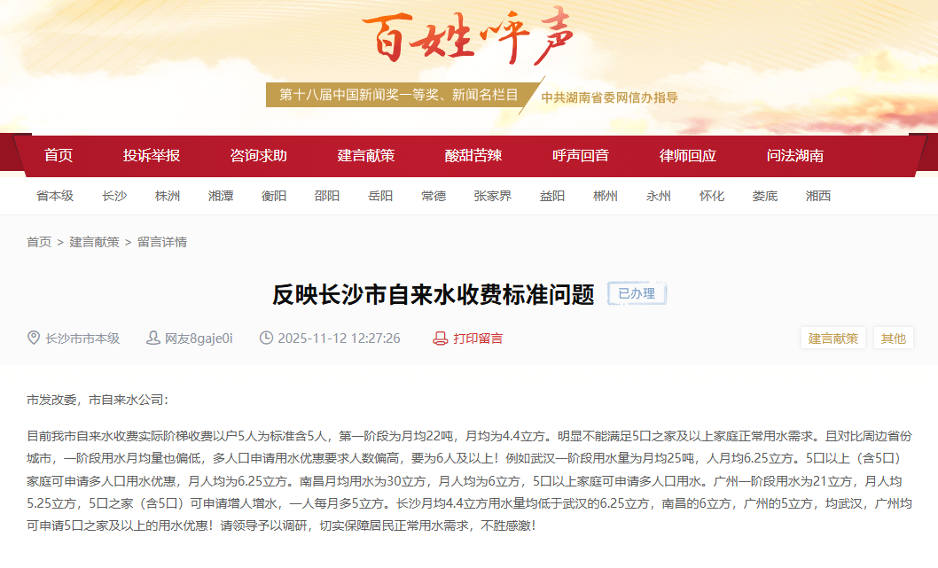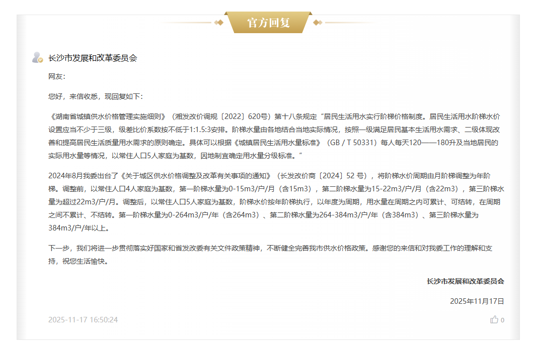 回复的重点在于,长沙已于2024年8月出台了新的供水价格政策,完成了一项关键改革:将阶梯水价的计价周期从“按月计算”调整为“按年计算”。