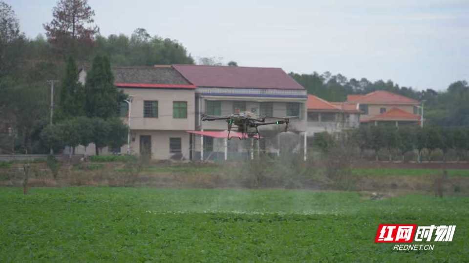岘山镇是当地重要的油菜产区,针对当前气象条件和油菜苗情,刘春桃作为油菜种植带头人,积极联系农技人员,组织村里其他的油菜种植户提前开展田间管护工作,运用植保无人机开展飞防作业。伴随着无人机匀速飞行,氟啶胺和叶面肥等药肥混合液均匀喷洒在油菜叶面上,能有效促进植株茁壮成长。