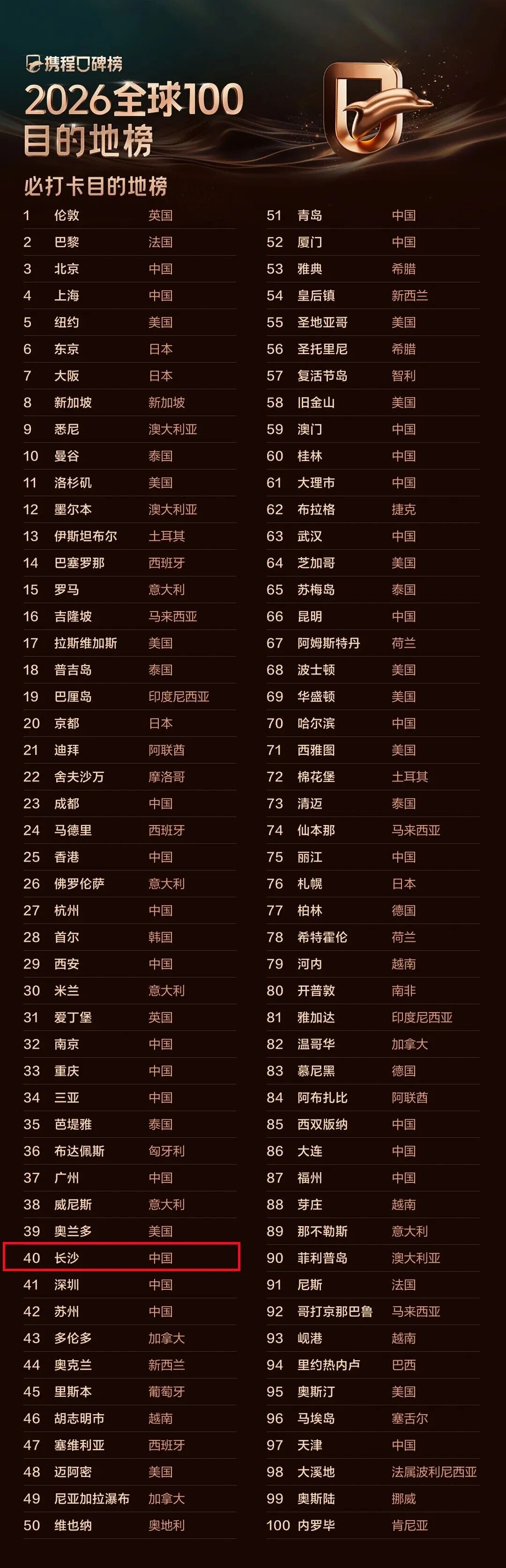 在本次全球100目的地“必打卡目的地榜”中,长沙与北京、上海、成都、香港、西安、南京、重庆、三亚共同跻身前40,既凸显了其在全国文旅格局中的重要地位,更印证了中部城市文旅崛起的强劲势能。