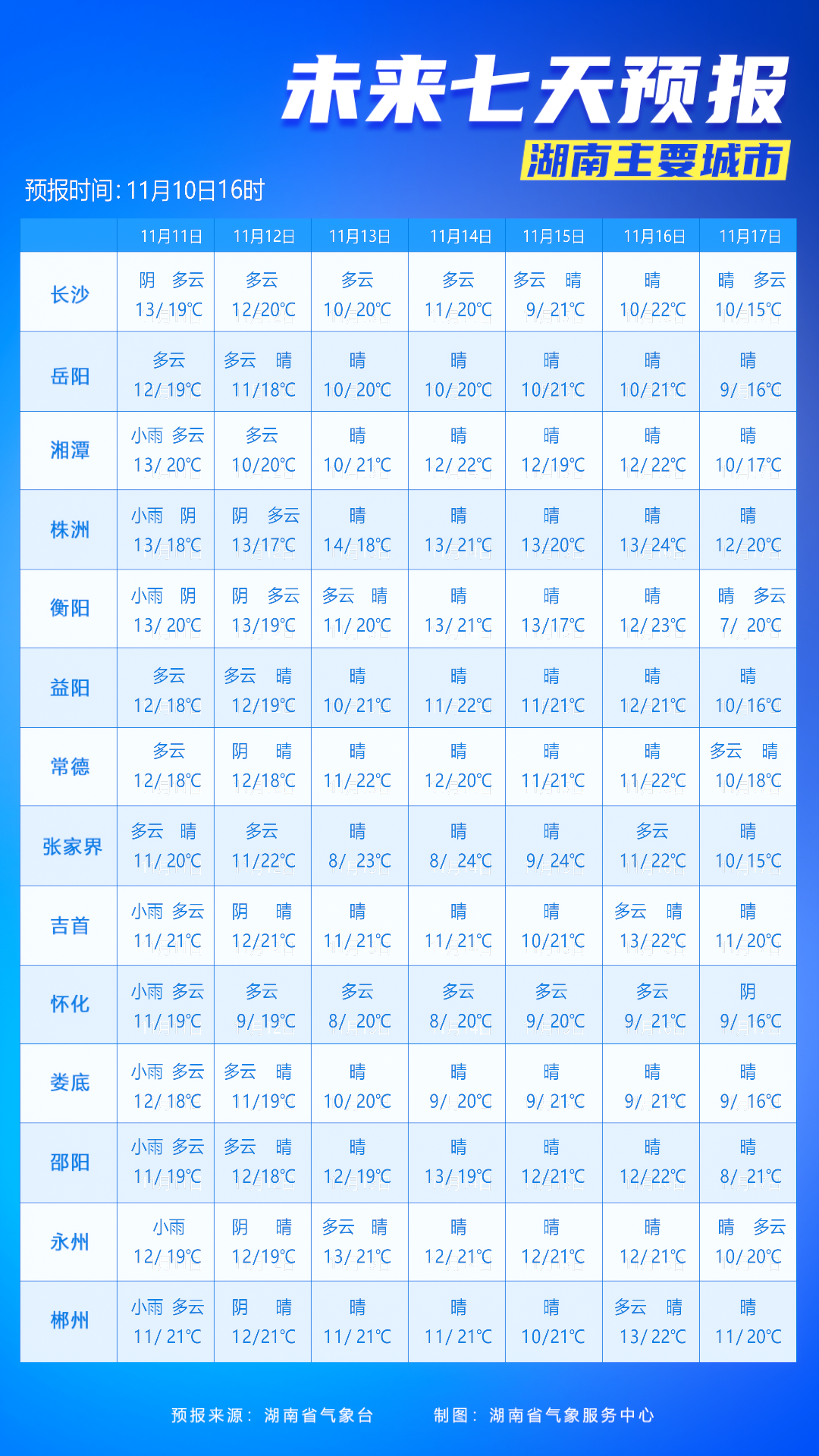 11日晚上至12日白天,全省多云间晴天;北风2~3级;最低气温湘西9~11℃,其他地区12~14℃;最高气温18~21℃。
