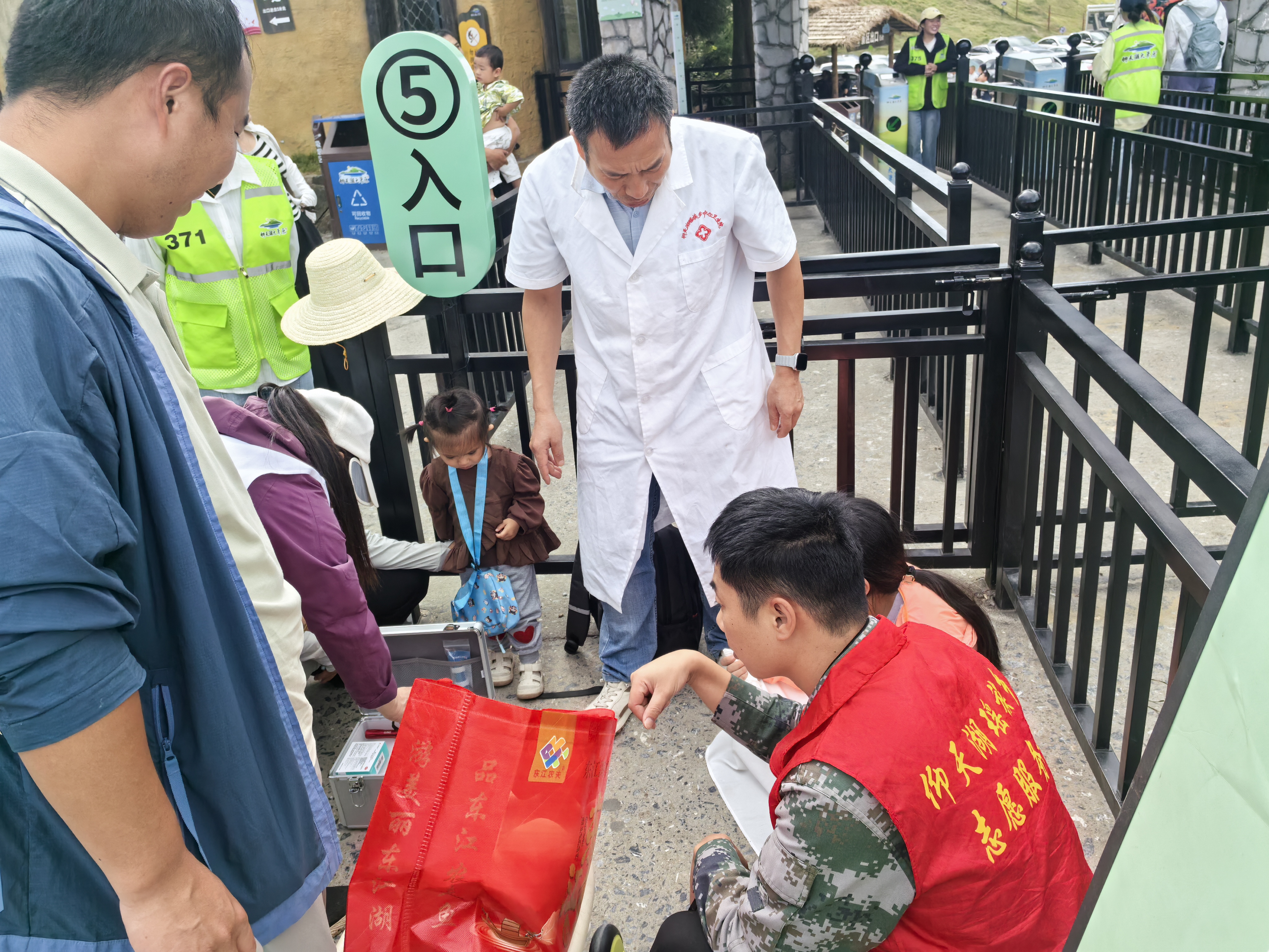 仰天湖瑶族乡干部志愿者帮助受伤游客处理伤口。