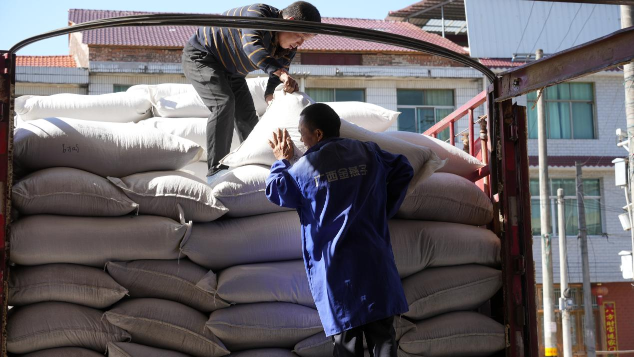 满装优质稻种正准备发往东南亚(邓钊 摄)