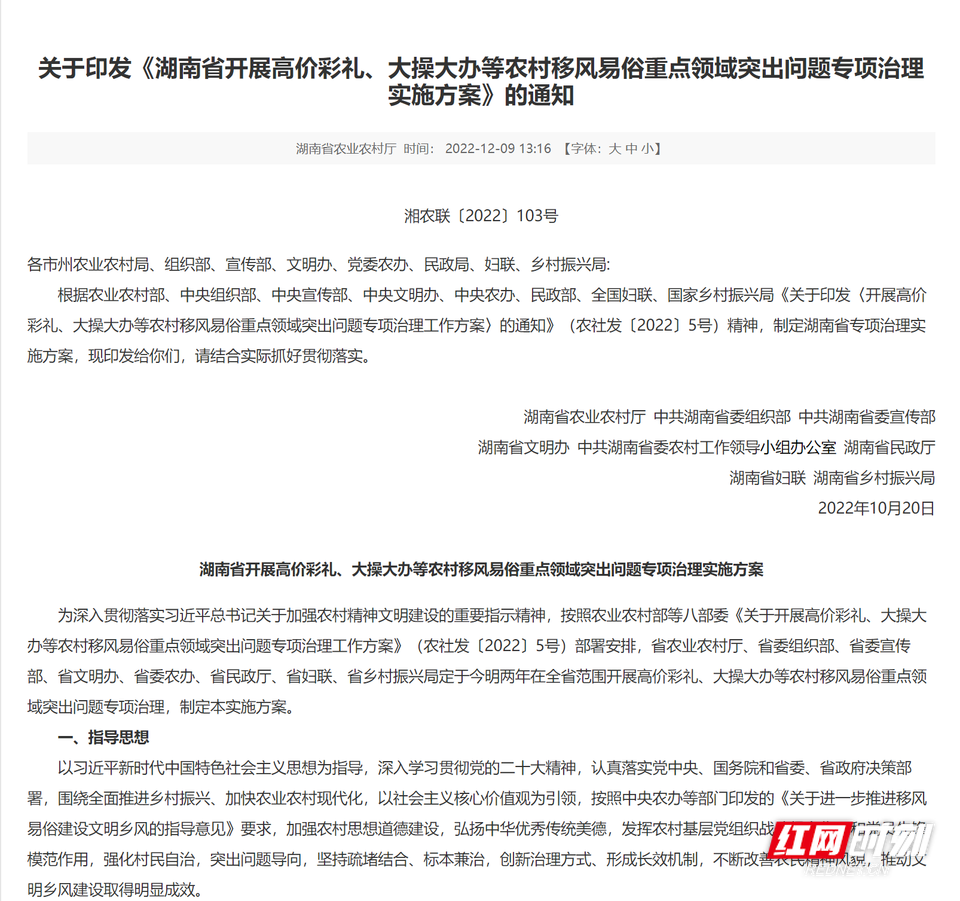 2022年,湖南印发《高价彩礼、大操大办等农村移风易俗重点领域突出问题专项治理实施方案》。