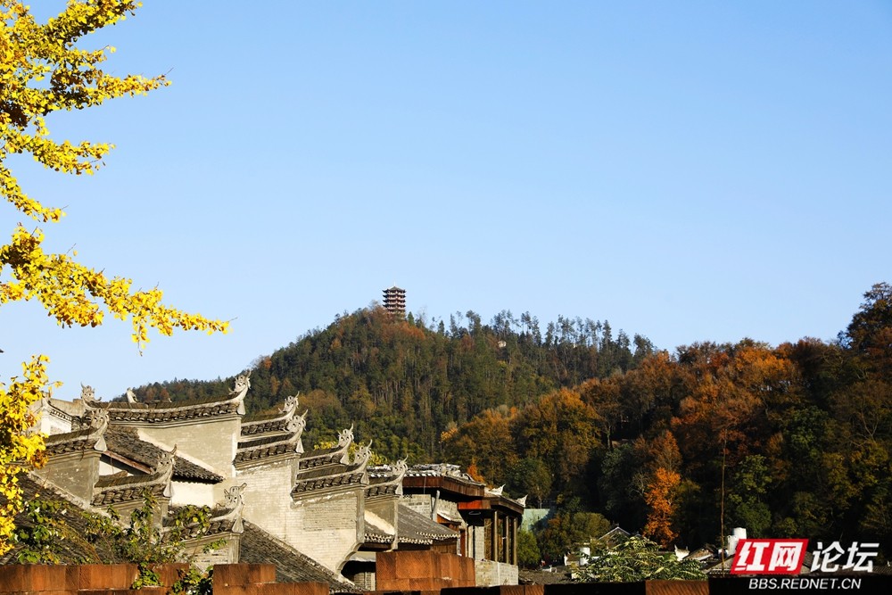 远山泛黄的树叶、湛蓝的天空,将山山巅八角楼映衬格外明朗。(图源:滕建康)