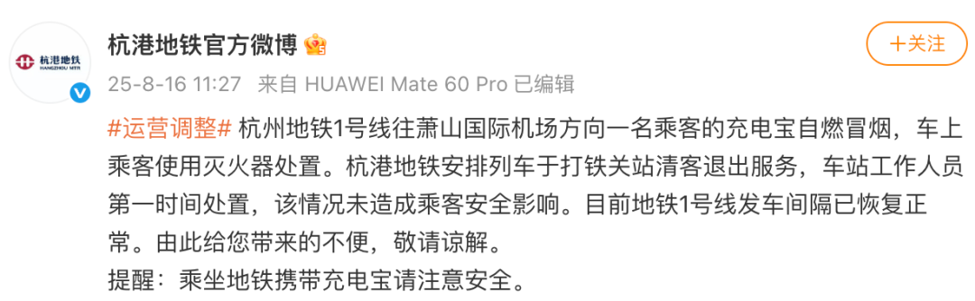 后经地铁工作人员确认,是乘客携带的充电宝突发自燃,所幸处置疏散及时,并无人员伤亡。