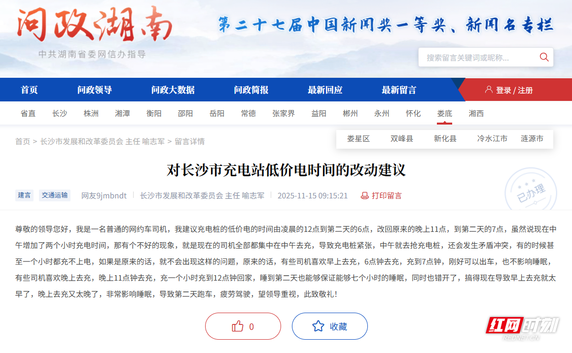 红网时刻新闻11月21日讯(记者 陈星晓)近日,一名长沙网约车司机在红网《问政湖南》栏目留言,反映在新的分时电价政策下,充电桩在午间低价时段异常紧张,建议调整低价时段设置,引发广泛关注。该网友的建议得到长沙市发展和改革委员会及时回应,解释了分时电价政策调整的原因。