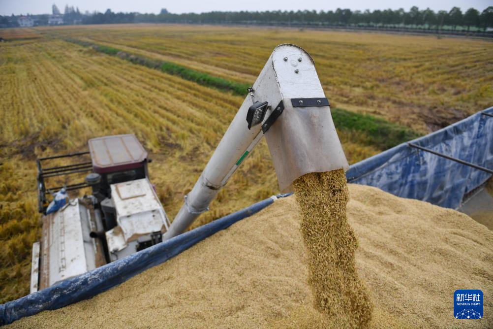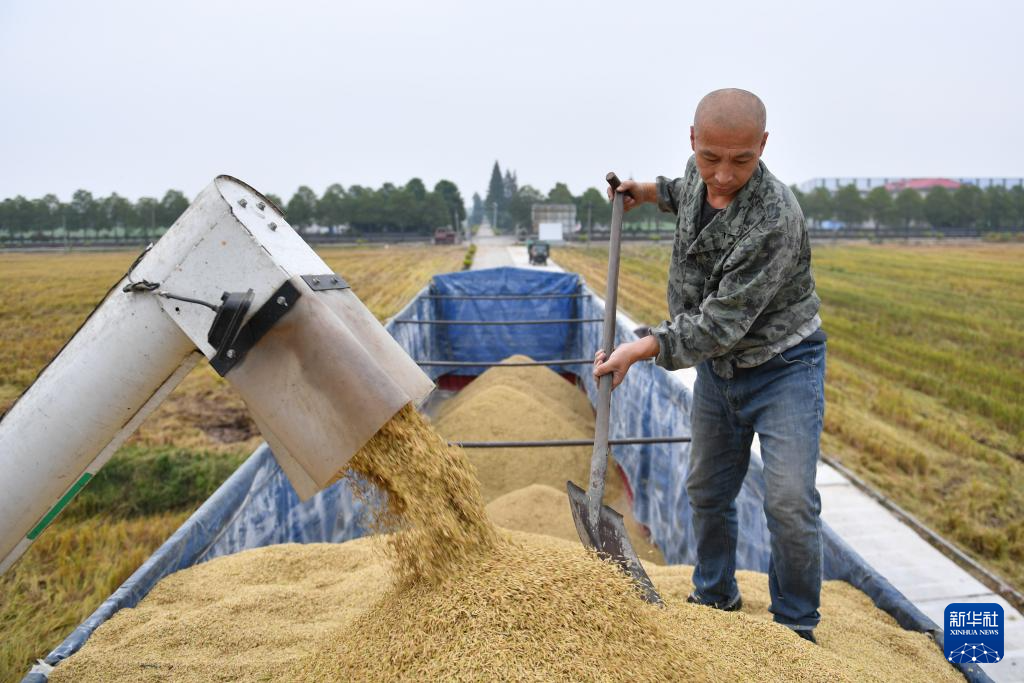 10月29日,在大通湖区河坝镇王家湖村,农机手驾驶收割机将稻谷装车。新华社记者 陈振海 摄