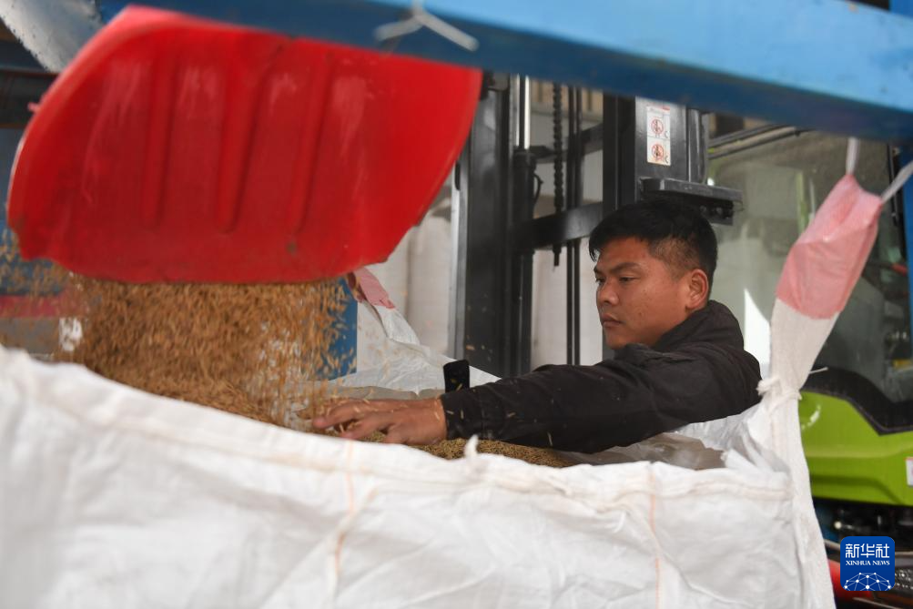 10月30日,邱彬将烘干后的稻谷装袋。新华社记者 陈振海 摄