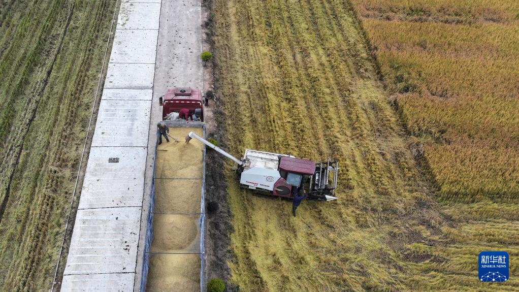 10月29日,在大通湖区河坝镇王家湖村,农机手驾驶收割机将稻谷装车(无人机照片)。新华社记者 陈振海 摄