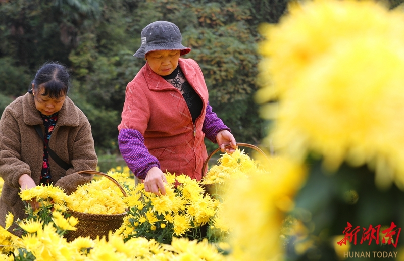 11月7日,衡阳市南岳区寿岳乡岳林村皇菊种植基地,村民在采摘高山皇菊。时值立冬,该基地种植的高山皇菊进入采摘期,村民抢抓晴好天气进行采摘、加工,供应市场。近年来,该村依托高山林地以其南岳旅游优势,规模化发展兼具观赏价值与经济价值的高山皇菊产业,推动当地农旅融合发展,带动农民增收。