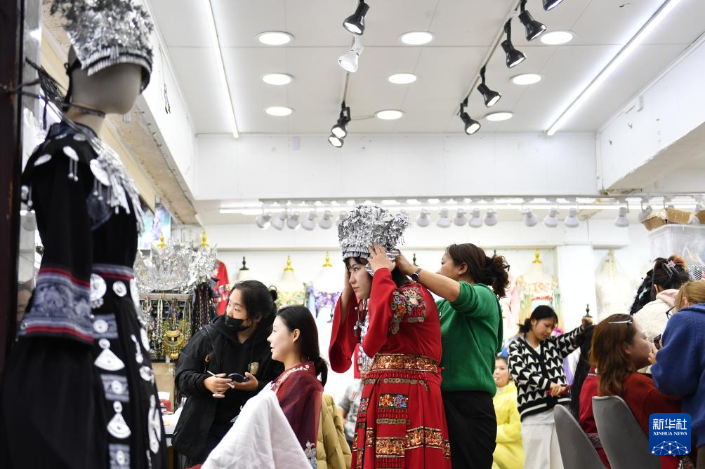 11月6日,游客在凤凰古城一家旅拍店内准备着装。新华社记者 陈振海 摄