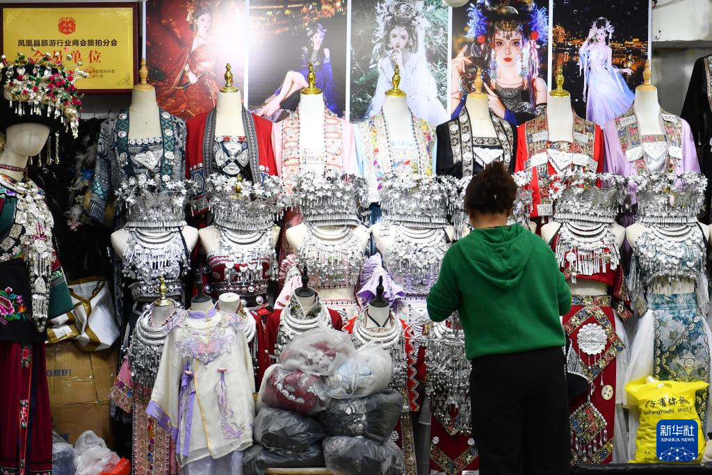11月6日,凤凰古城一家旅拍店店主在店内整理服装。新华社记者 陈振海 摄
