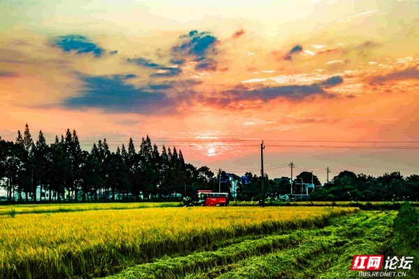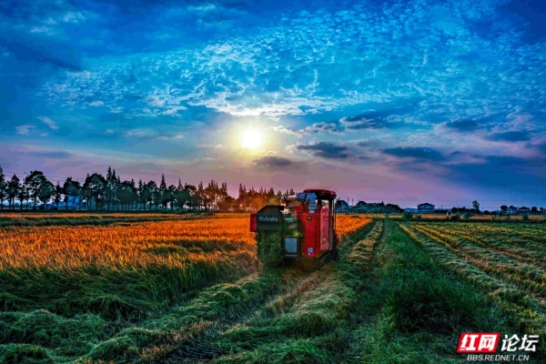 农舍错落,树木成排,蓝天与晚霞为这幅秋收图晕染出斑斓底色。从晨光熹微到暮色四合,机械的身影在田野间穿梭,既是对土地馈赠的回应,也是乡村振兴中农业现代化的生动注脚。
