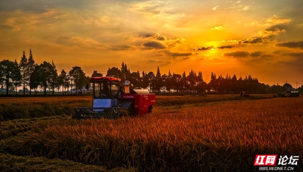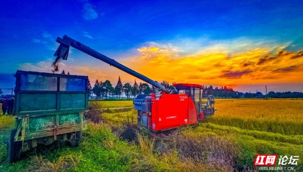 秋日的益阳市资阳区美丽乡村,大地铺就彩色诗行。连片稻田如鎏金的海洋,在微风里漾起层层涟漪。红色的收割机是田野里的“丰收捕手”,在夕阳的晕染下,将饱满的稻穗卷入机械的“臂膀”,把丰收的颗粒源源不断送入车斗,轰鸣的引擎奏响了现代农业的丰收交响。
