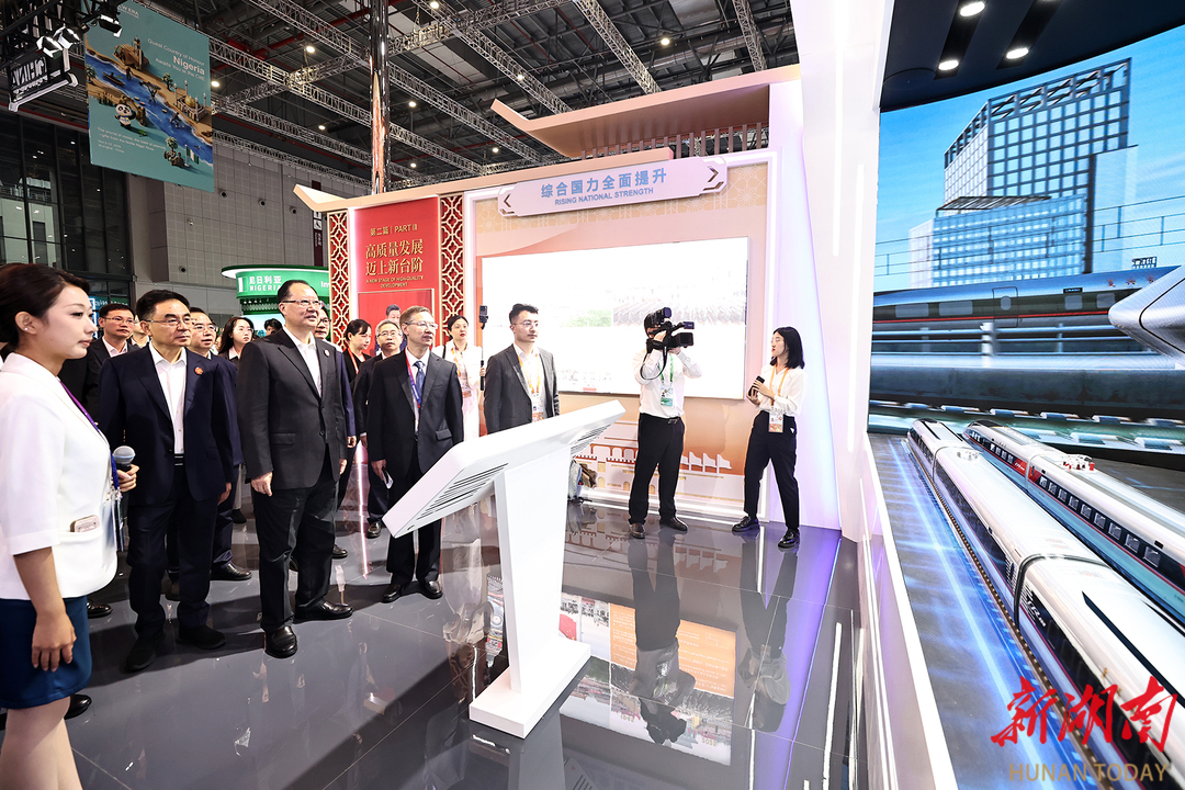 进博会湖南常设馆聚焦“开放湖南, 湘遇世界”主题,以山水为幕、以人文为脉、以智造为桥,组织60余家湘企整装亮相,布展面积较上一届增加了一倍。毛伟明饶有兴致地参观展陈,勉励大家精心打造“湖南城市会客厅”,更好发挥展洽联动作用,全方位展示“湘”品形象、立体式讲好湖南故事、精准化对接全球资源。