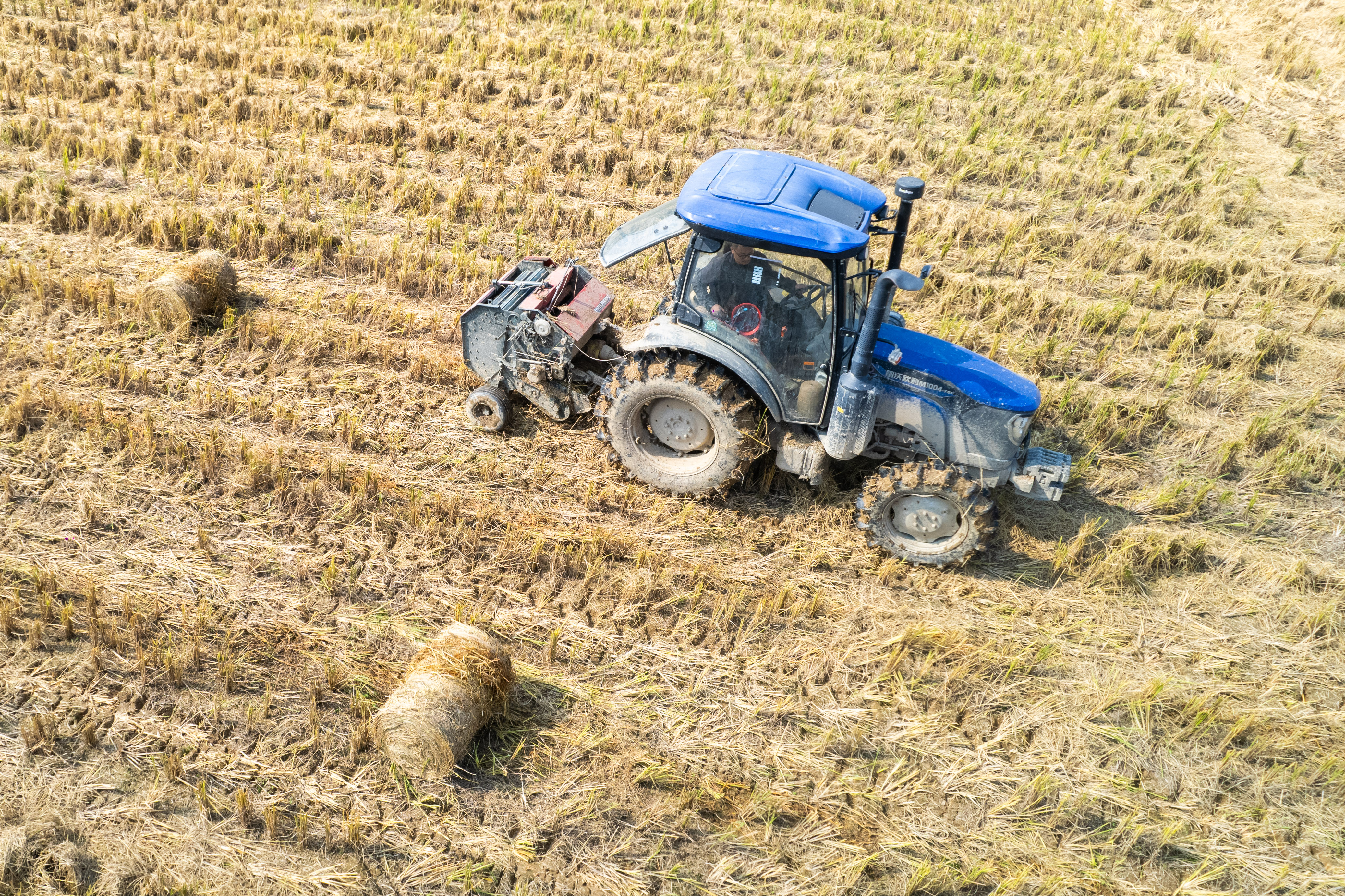 ↑ 11月5日,在长沙县开慧镇开慧村,村民操作牵引式秸秆打捆机回收水稻秸秆(无人机照片)。
