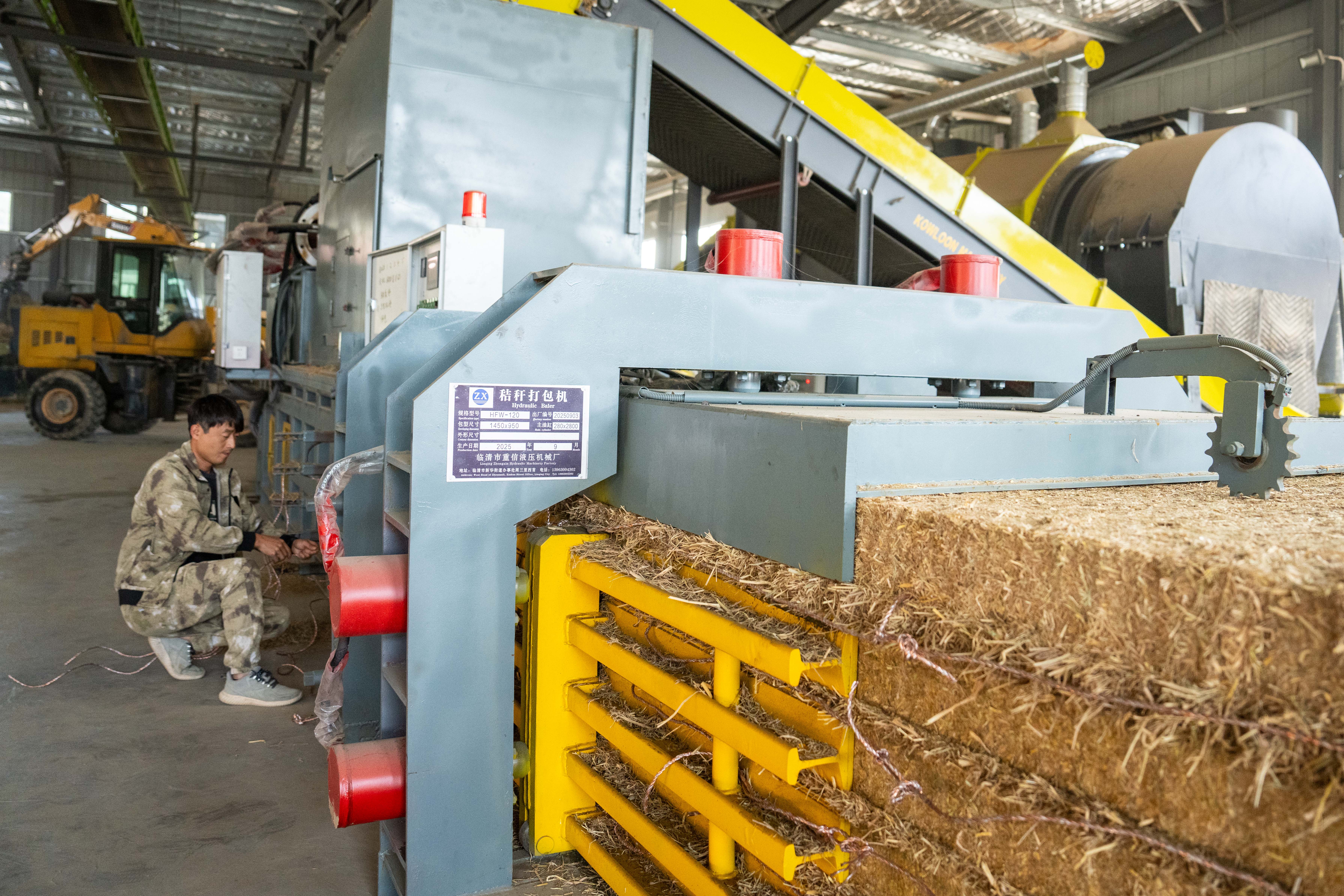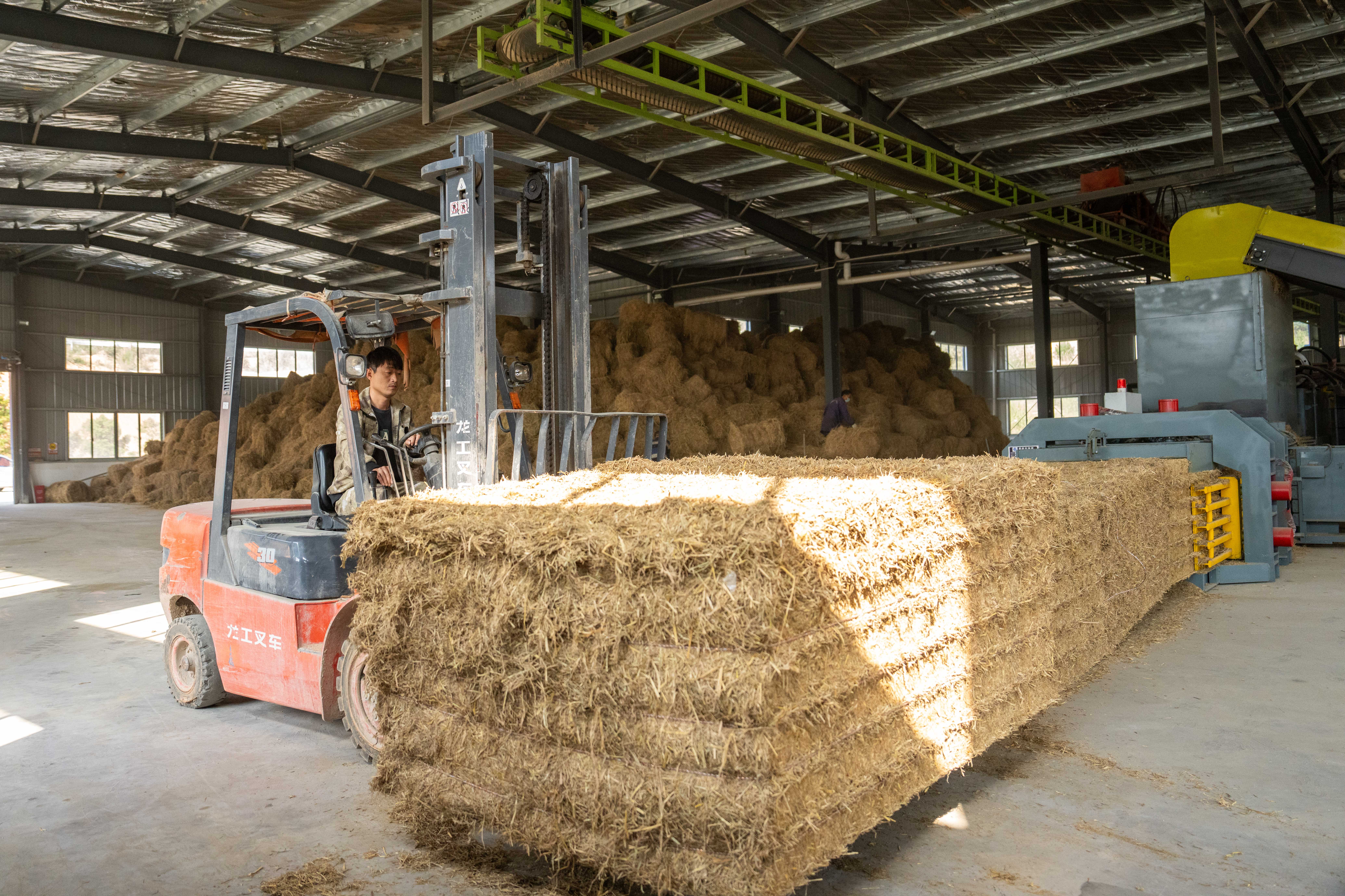 ↑ 11月5日,在位于长沙县开慧镇的长沙萱凡农业发展有限公司秸秆饲料化加工车间,工人操作秸秆打包机。