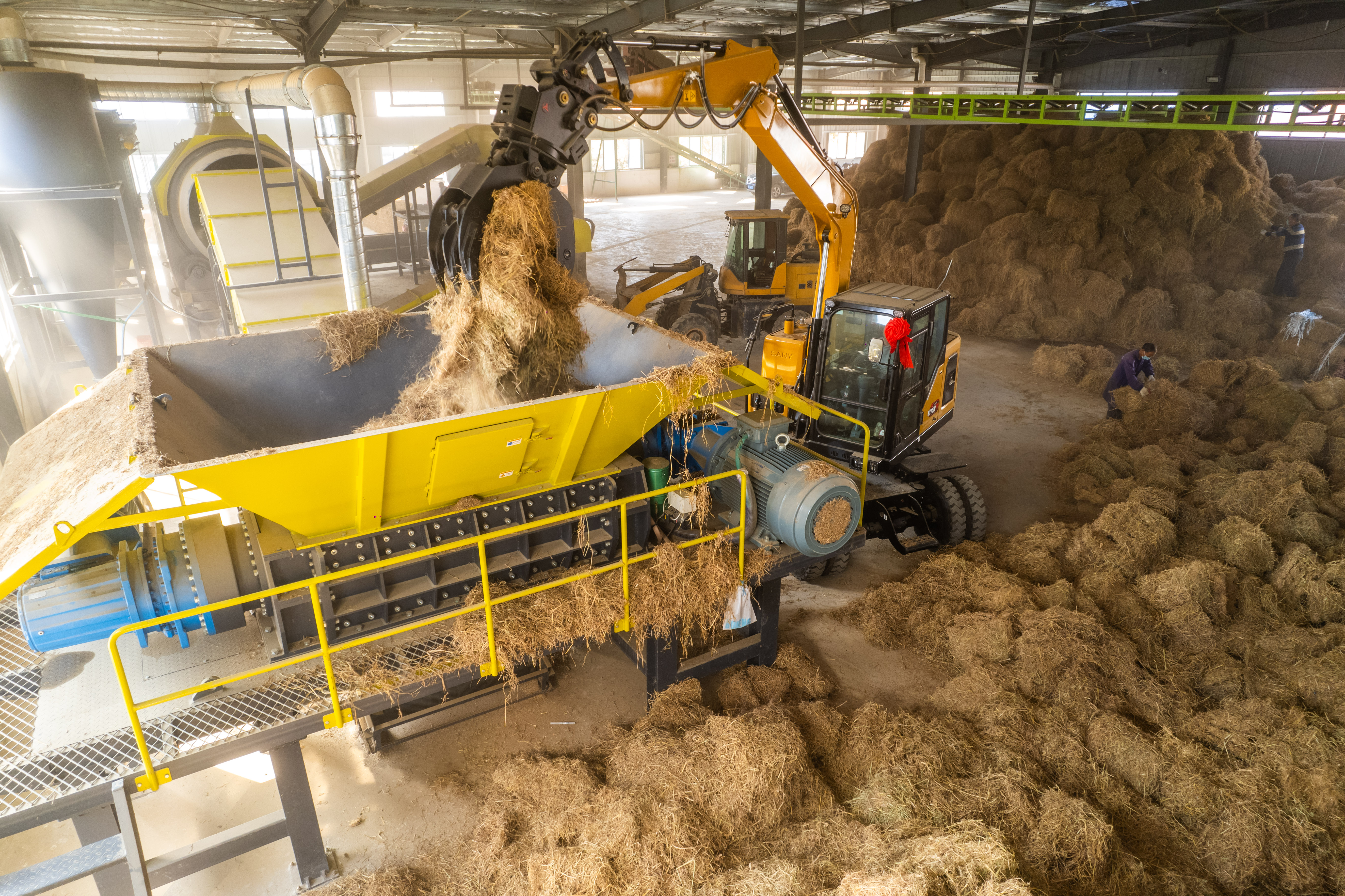 ↑ 11月5日,在位于长沙县开慧镇的长沙萱凡农业发展有限公司秸秆饲料化加工车间,工人把秸秆放入饲料加工设备(无人机照片)。